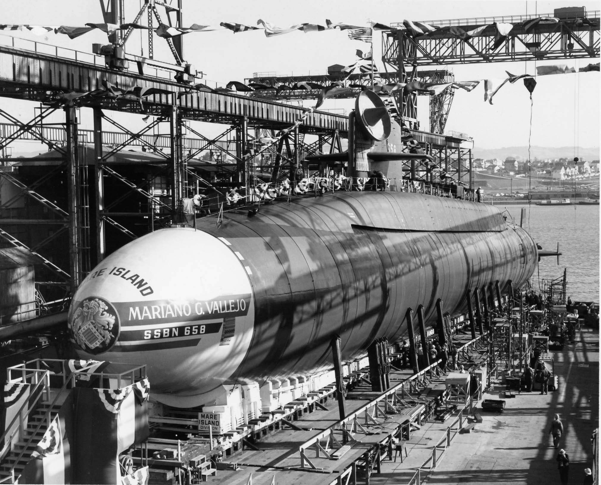 The contract to build Mariano G. Vallejo was awarded to Mare Island Naval Shipyard at Vallejo, California, on 8 August 1963 and her keel was laid down there on 7 July 1964. She was launched on 23 October 1965, sponsored by Miss Patricia O. V. McGettigan, and commissioned on 16 December 1966, with Commander Douglas B. Guthe commanding the Blue Crew and Commander John K. Nunneley commanding the Gold Crew.