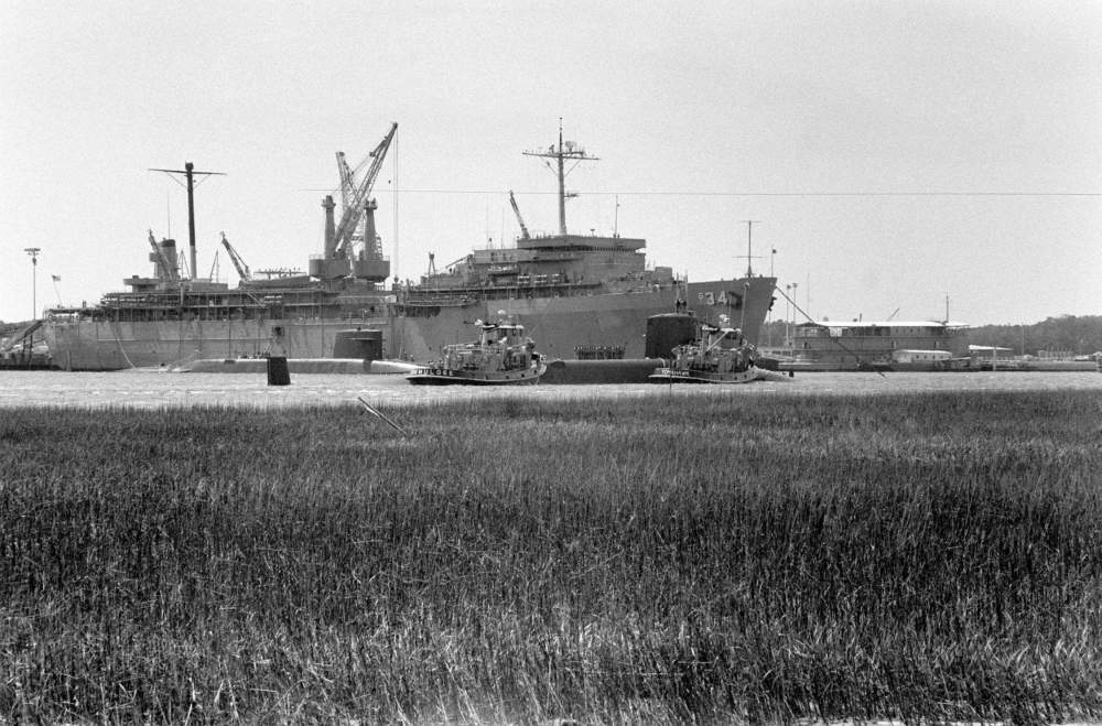 Caption for picture: The nuclear-powered ballistic missile submarine Mariano G. Vallejo (SSBN-658) is assisted into a dock by the large harbor tugs Okmulgee (YTB-765) and Tomahawk (YTB-789) at Naval Submarine Base Kings Bay, Georgia, 4 April 1987. The Mariano G. Vallejo has just completed the 2,500th deterrent patrol by a fleet ballistic missile submarine of the United States Navy. Another submarine is moored alongside the fleet ballistic missile submarine tender Canopus (AS-34) is in the background.