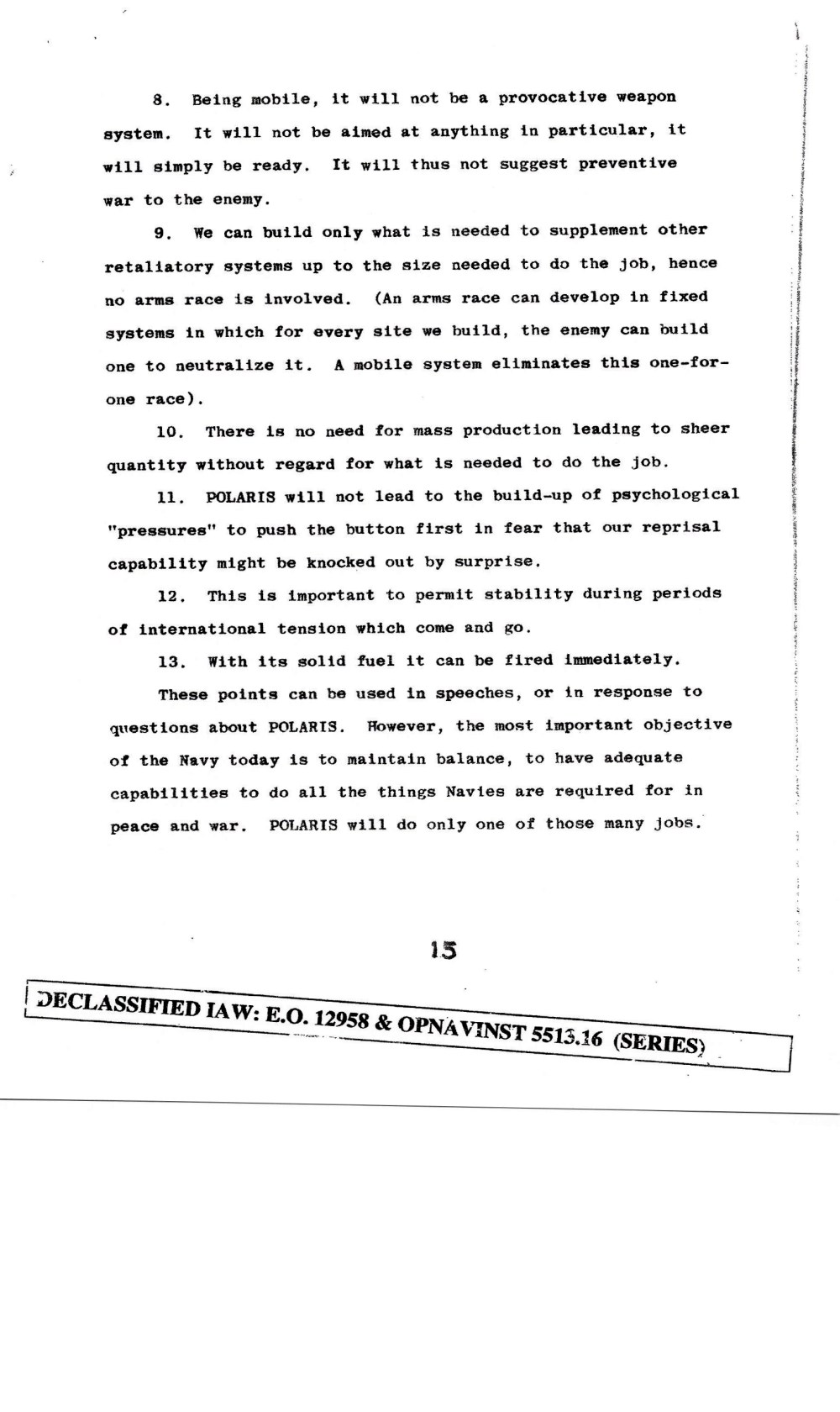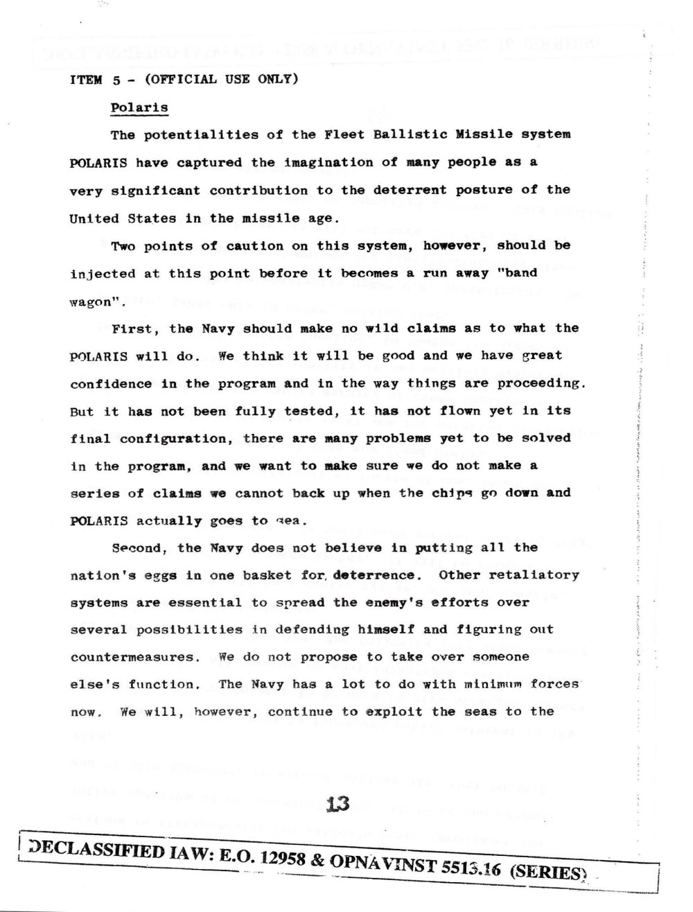CNO Personal No. 35, To: Flag and General Officers, Subj: Dope, 5 March 1958, Secret, Excerpt: Item 5 on “Polaris” (pages 13-15), Secret