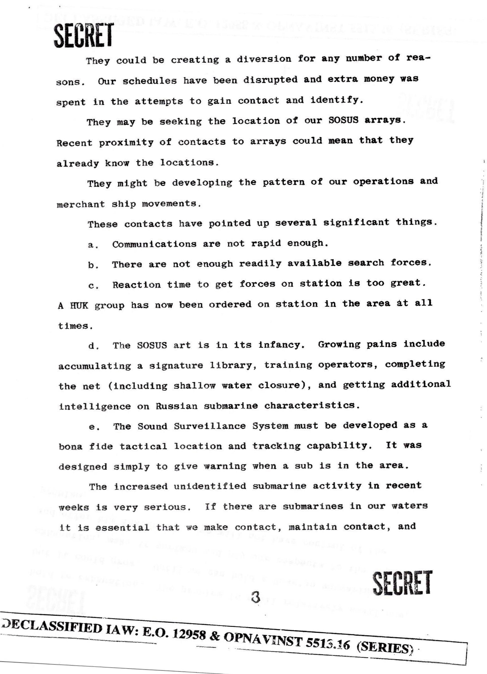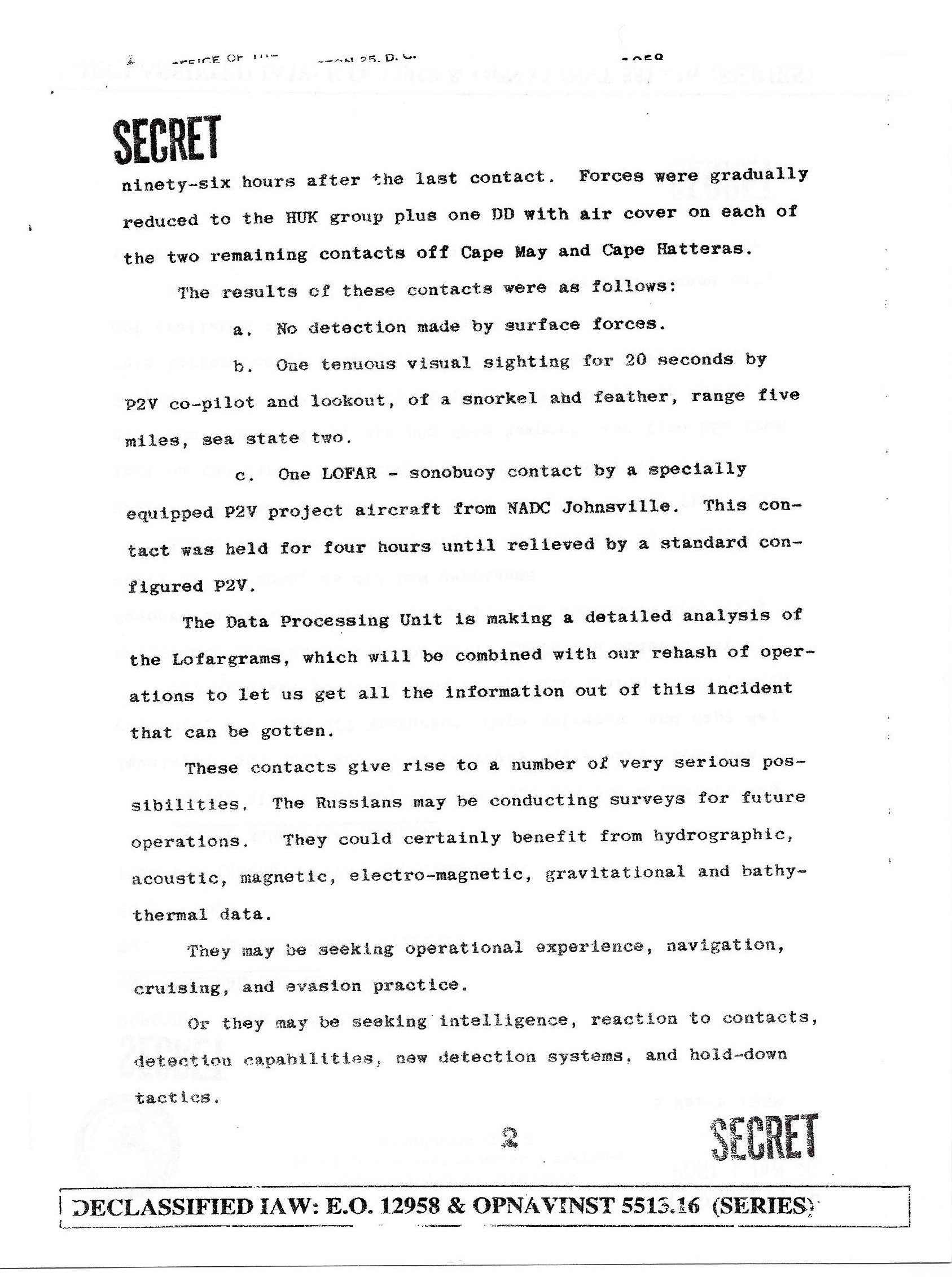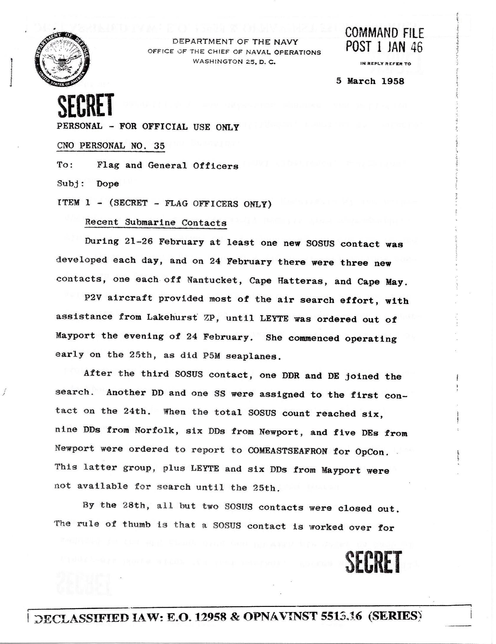Many of those memos are now declassified. CNO Personal Number 35 was issued to discuss the increase of Soviet submarine activity in the Atlantic region as well as to discuss the coming Polaris Missile system. Admiral Burke wanted to make sure that the system was not over-exaggerated before it became fully operational.
