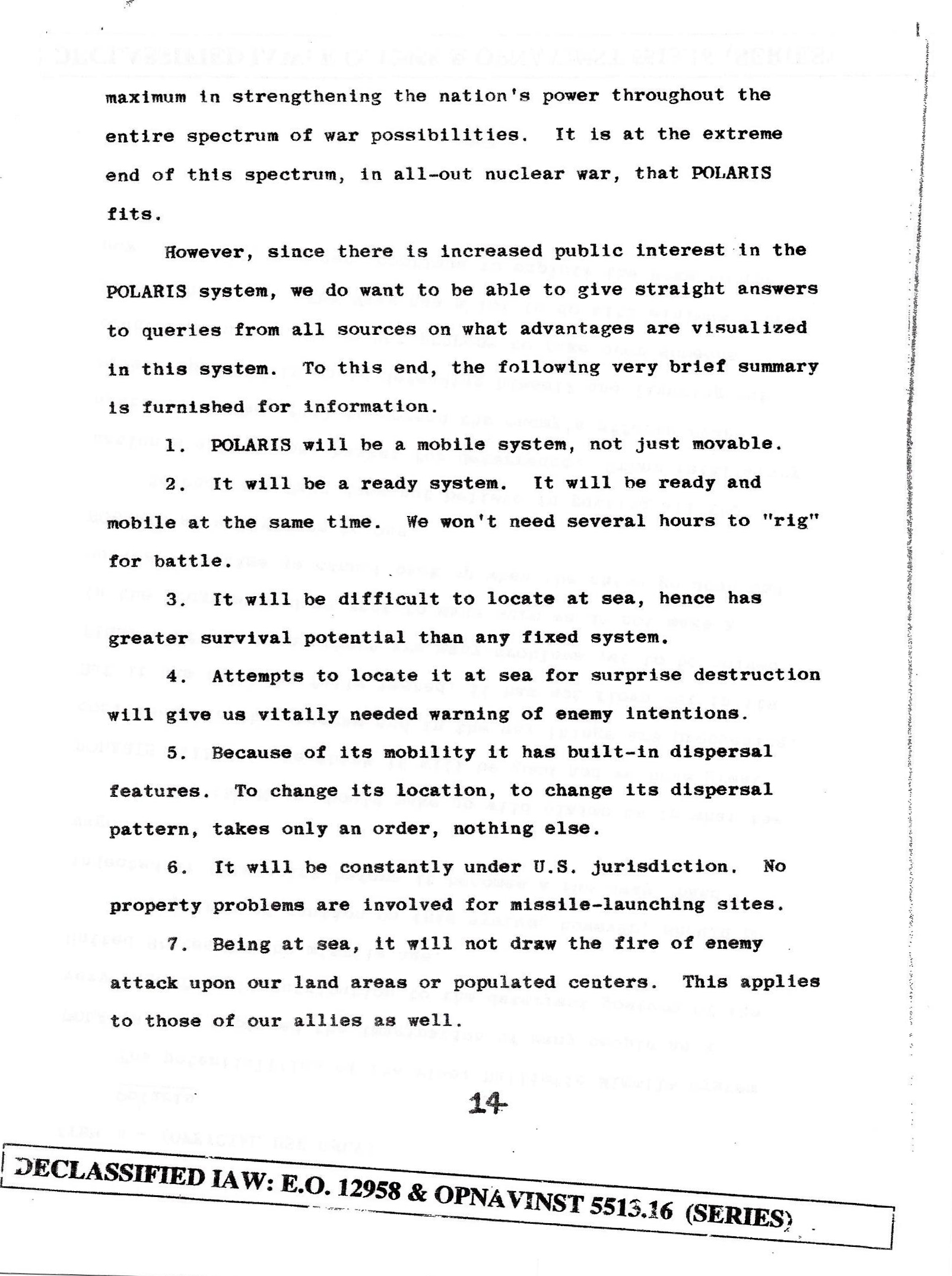 CNO Personal No. 35, To: Flag and General Officers, Subj: Dope, 5 March 1958, Secret, Excerpt: Item 5 on “Polaris” (pages 13-15), Secret