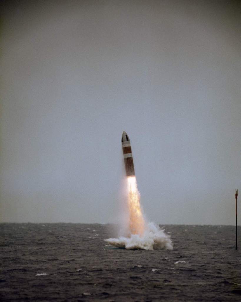 Picture Caption: A UGM-73 Poseidon C-3 submarine-launched ballistic missile is launched from the nuclear-powered ballistic missile Will Rogers (SSBN-659) on 20 May 1986. This is the 81st launch of a Poseidon missile and the 61st from a submarine.