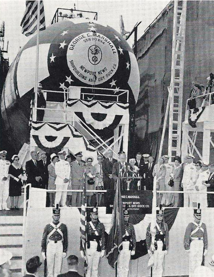 Following shakedown, George C. Marshall prepared for duty as one of the Navy’s nuclear powered Polaris sub marines silently and invisibly roving the seas as a mighty deterrent against aggression, preserving peace and protecting freedom. At her launching former Secretary of State Dean Acheson eloquently described the mighty sub marine’s role in the turbulent cold war: “. . . the waves set up by this launching will go to the furthest reaches of our foreign relations. The very existence of this ship, her power, her mission, her orders, her competence to execute them, will effect more computations, more decisions, than we can readily imagine. Far beyond the Pentagon, the State Department, and the White House she will add a new factor, a new magnitude, to the correlation of forces by which the communists determine their decisions.”