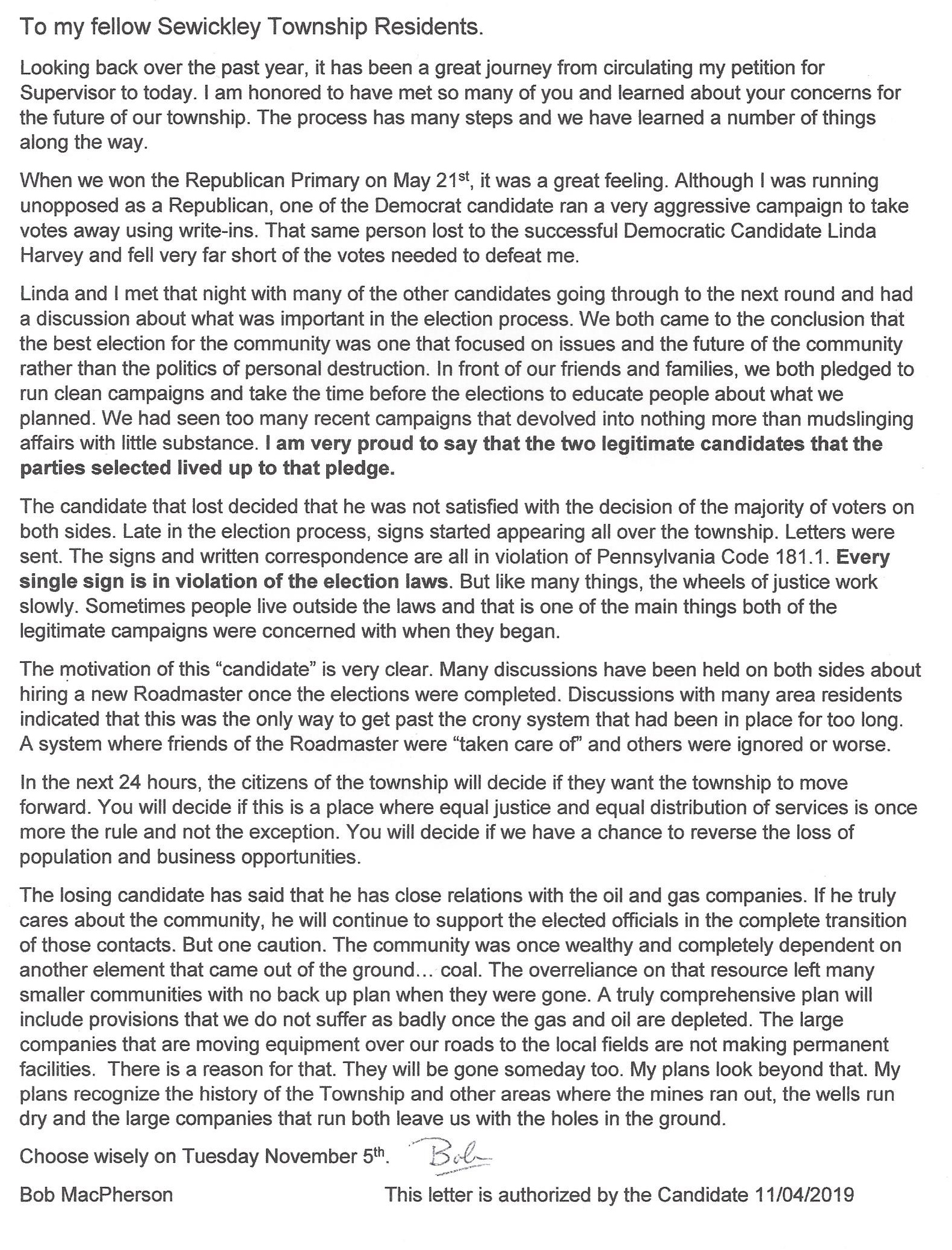 I leave you with this last letter to my constituents. We had a chance to have a textbook election in our township. But I am coming to find out that as long as people are involved, the textbook will need to continually be re-written. Maybe that is the next path for me whether I win or lose.