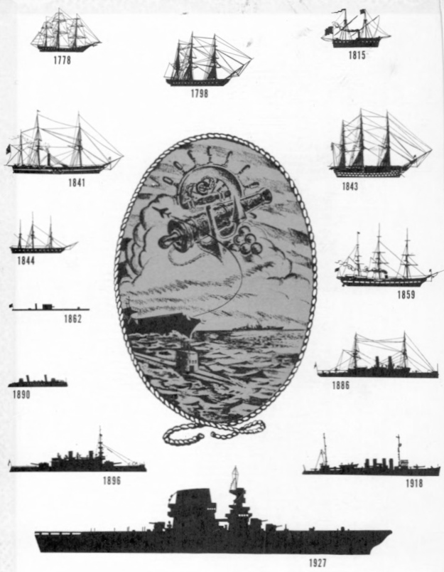 From our earliest struggles for independence to our present position of world dominance, our country’s history is replete with stirring and heroic episodes of fighting ships. The steady advance of our maritime power is symbolized by the wealth of tradition encompassed between John Paul Jones’ immortal, “I have not yet begun to fight,” and the message, “Underway on nuclear power,” from U.S.S. Nautilus.