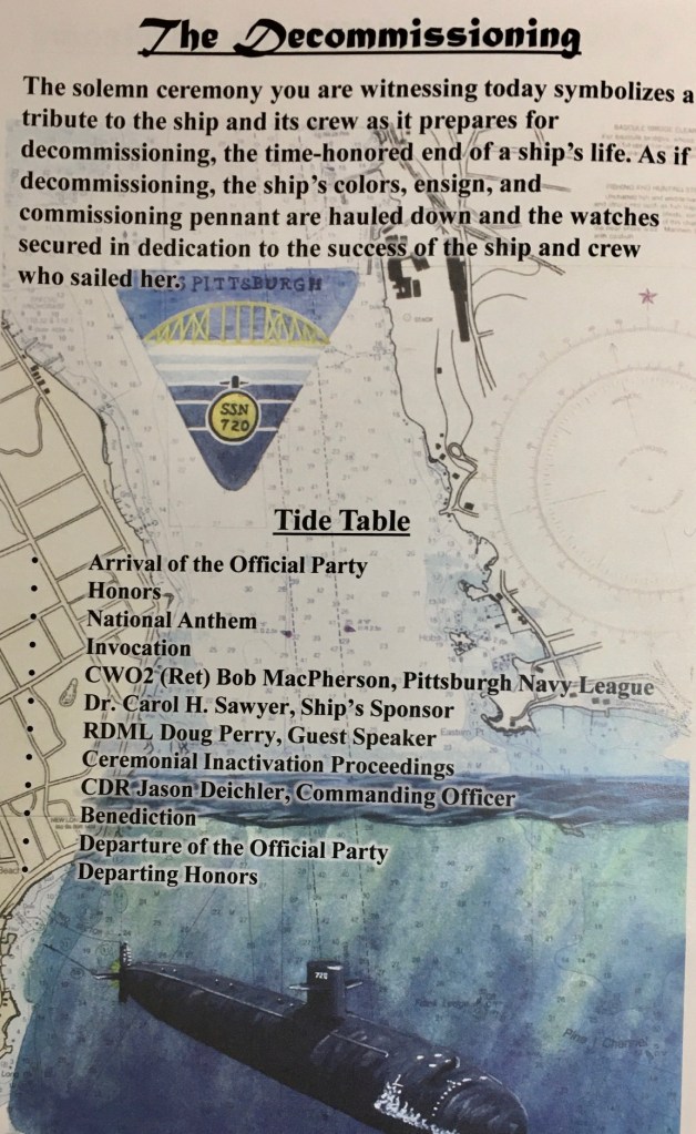 Overwhelmed with CDR Jason Deichler’s both poignant and upbeat and faith-based remarks at the inactivations/decommissioning of the USS Pittsburgh (SSN 720). In all of my years as the sister of a now late submarine skipper, (USS Salmon (SN 573), I’ve never experienced firsthand a decommissioning. That so many traveleted to Keyport Washington ‘s U.S. Naval Undersea Museum is a testimonial to this 35-year-old lady and her so many sons. God Bless