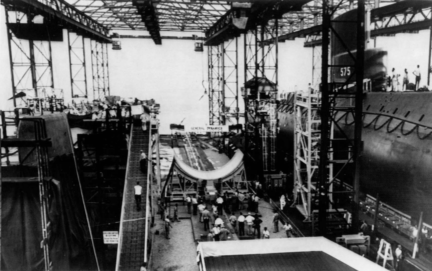 On July 21, 1955, the nuclear submarine Seawolf slid down the ways into the Thames River at Groton, Connecticut. As the tugs nudged the ship to the pier, Electric Boat shipyard workers laid the keel of the Skate (SSN578), the first of a new class of attack submarines using the S3W/S4W propulsion plant. Although the two events were timed to give maximum publicity to the company and to the nuclear submarines, they pointed up a significant fact: that Electric Boat was the only American yard which could build nuclear ships. That fact was hardly surprising only six months after the first sea trials of the Nautilus, but it suggested an important step the Navy would have to take in building a fleet of nuclear ships. Once the Navy had decided to build a class of nuclear submarines at more than one yard, it was possible to apply the lead-and-follow system which had been common Navy practice for decades. In essence the lead yard designed and usually built the first ship. The follow yards used the design and experience of the lead yard to construct the “follow ships.” The arrangement avoided a vast amount of duplication, particularly in producing the thousands of drawings required to design a modern ship.