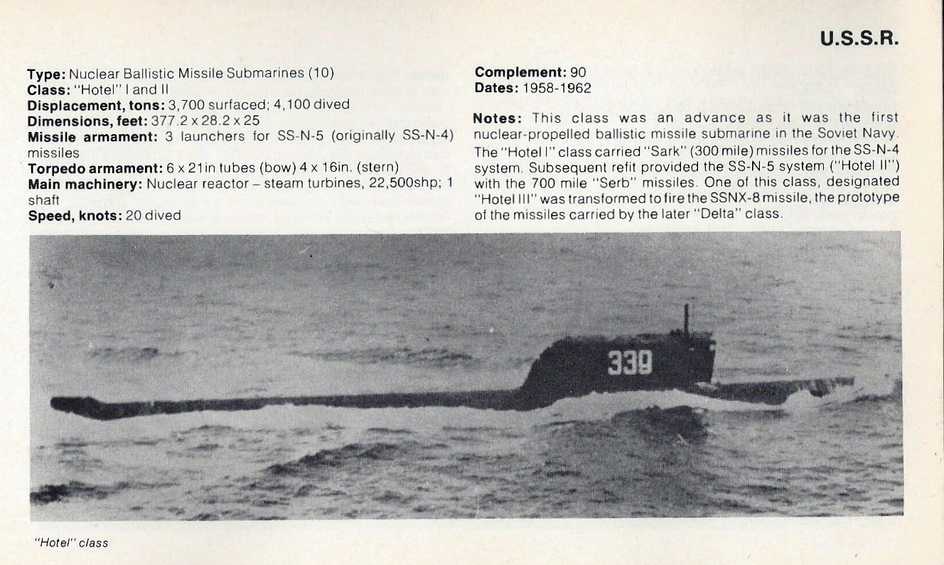 The earliest Soviet strategic-missile submarines constructed in the late 1950s posed little threat to the continental United States. These submarines had a limited underwater endurance, could only fire their missiles while on the surface, and were armed with only two or three SARK (SS-N-4) missiles which had a range of about 350 nautical miles and poor accuracy. These submarines also had operational problems with one GOLF-class SSB having been lost in the North Pacific in 1968, and one HOTEL- class SSBN experiencing serious engine trouble in the North Atlantic early in 1972. (The HOTEL was towed back to the Soviet Union on the surface.)