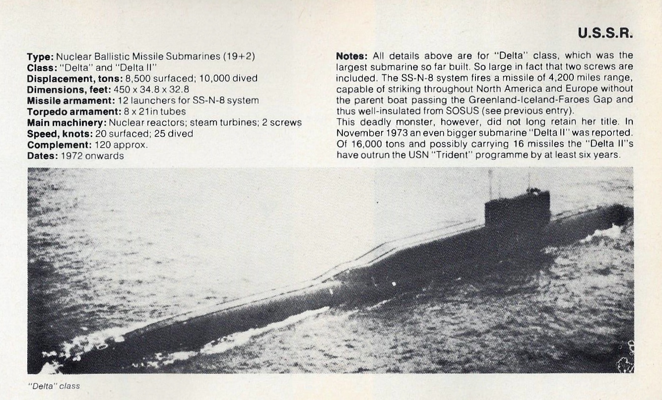 Construction of the enlarged, DELTA II sub marines are continuing while a still larger SSBN, referred to by a Soviet official as TYPHOON, is reported to be under construction. The DELTAs, at about 10,000 tons submerged displacement, are the world’s largest submarines now in service; the TYPHOON design is unofficially reported to approach the size of the still-building U.S. TRIDENT submarines, which will displace more than 18,000 tons submerged.