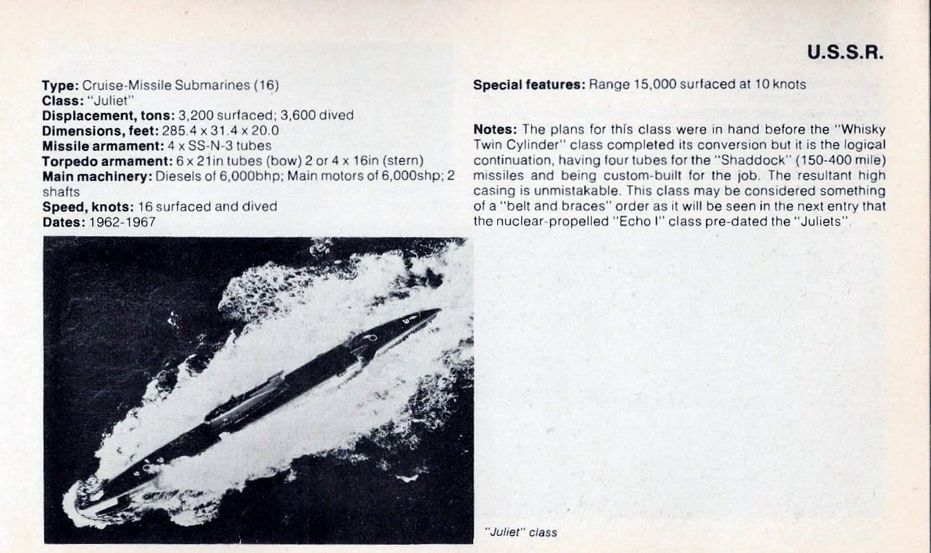 The Soviet Navy developed cruise missile submarines in the 1950s for strategic attack and as part of a strategy to counter U.S. aircraft carriers. Initially, existing submarines were converted to fire the long- range SS-N-3 missile. Then, newer submarines designed to carry the SS-N-3 joined the Soviet fleet, the diesel-powered JULIETT class and the nuclear- powered ECHO I and II classes.