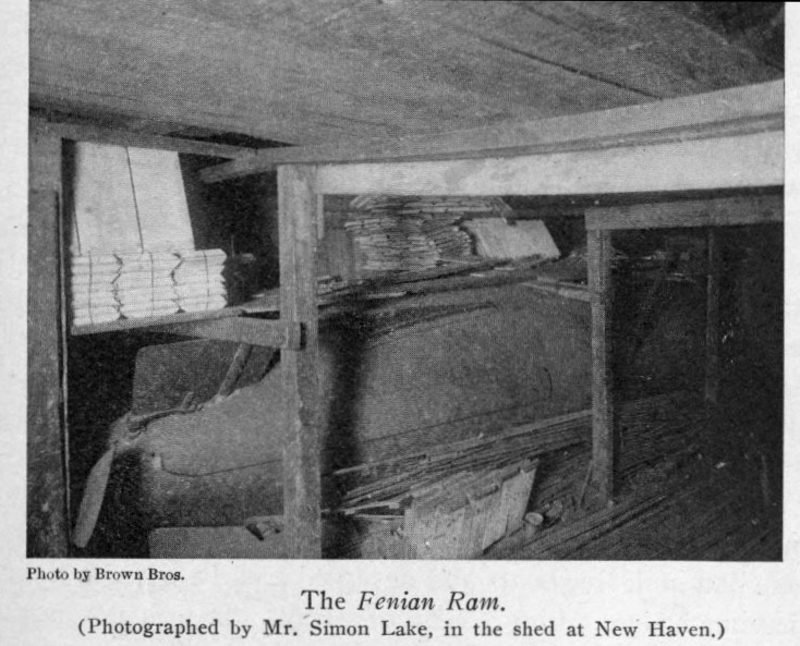 Political as well as financial complications caused the internment of this submarine, which a New York reporter, with picturesque inaccuracy, called the Fenian Ram. The Irish at home were by this time thinking less of fighting for independence and more for peacefully obtaining home rule, while the arbitration and payment of the “Alabama claims” by Great Britain had removed all danger of a war between that country and the United States. Under these circumstances, many of the Fenians felt that it was wasted money for their society to spend any more of its funds on warships it could never find use for. This led to dissensions which culminated in a party of Fenians seizing the Ram and taking it to a shed on the premises of one of their members at New Haven, where it has remained ever since.