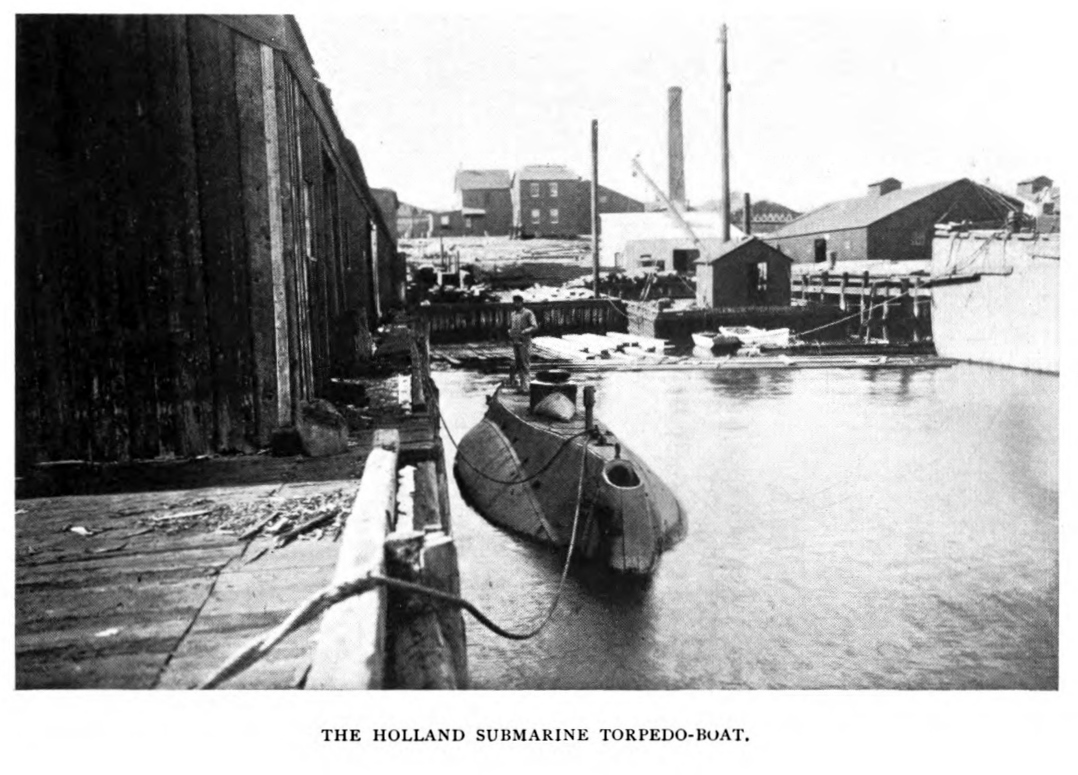 “She (the earlier one) was the first submarine since Bushnell’s time employing water ballast and always retaining buoyancy, in which provision was made to insure a fixed center of gravity and a fixed absolute weight. Moreover, she was the first buoyant submarine to be steered down and up in the vertical plane by horizontal-rudder action as she was pushed forward by her motor, instead of being pushed up and down by vertical-acting mechanism. Her petroleum engine, provided for motive-power and for charging her compressed-air flasks, was inefficient, and the boat therefore failed as a practical craft; but in her were demonstrated all the chief principles of successful, brain-directed, submarine navigation. In 1881, Holland turned out a larger and better boat in which he led the world far and away in the solution of submarine problems, and for a couple of years demonstrated that he could perfectly control his craft in the vertical plane. Eventually, through financial complications, she was taken to New Haven, where she now is.”