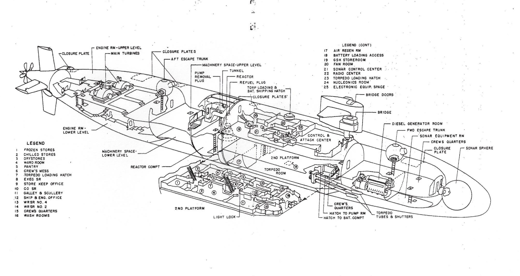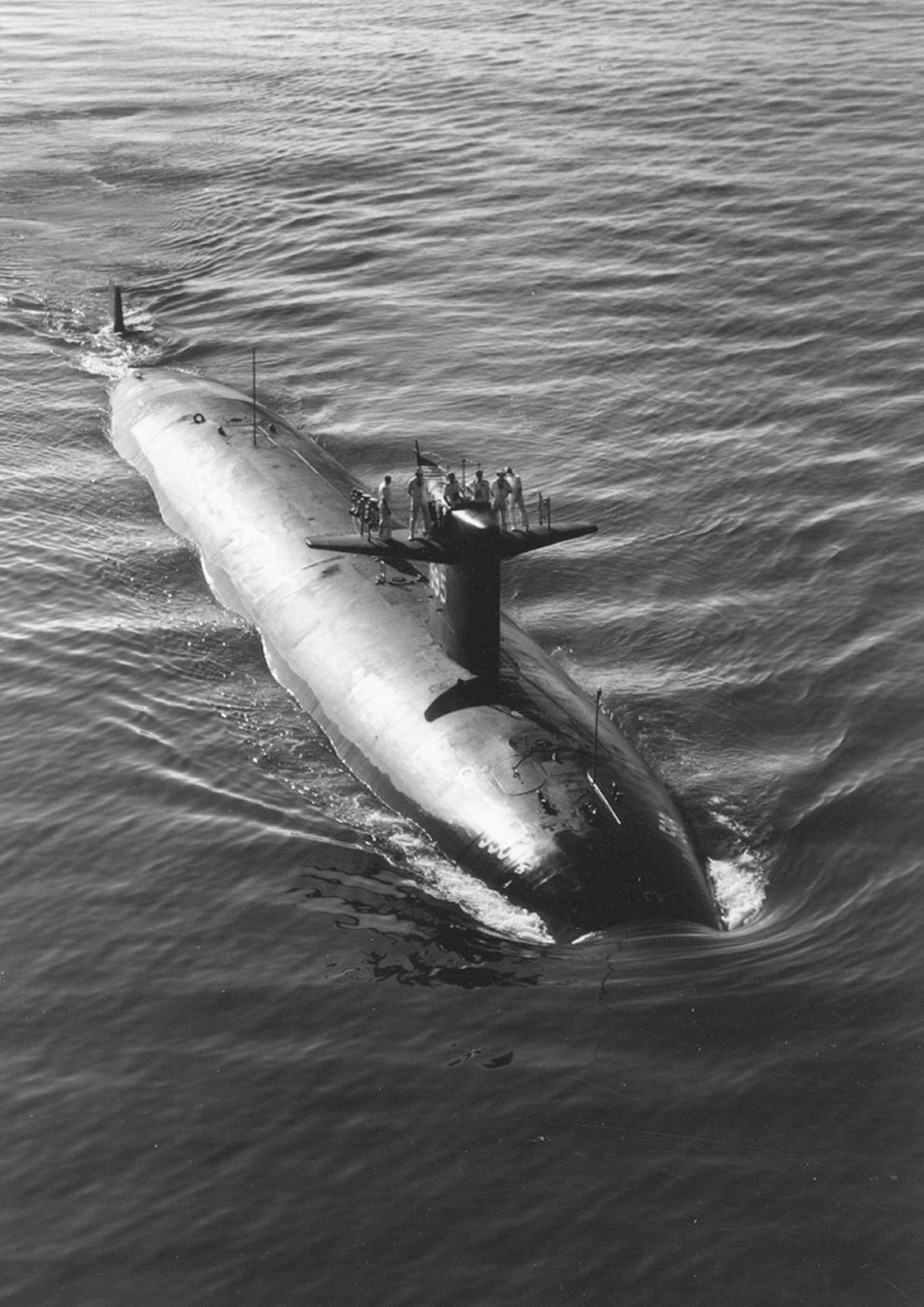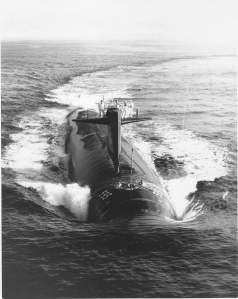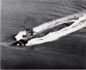 Specifications: Displacement, Surfaced: 3,540 t., Submerged: 4,200 t.; Length 278′ 5″; Beam 31′ 8″; ; Speed, Surfaced 15 kts, Submerged 28+ kts; Operating Depth 400′; Complement, 143; Sensors, Raytheon BQS-6A or -6B active/passive systems BQQ-1 and the Edo BQR-7 passive, conformal array, TB-26 Towed Sonar Array; Armament, four 21″ torpedo tubes, forward, MK 48 torpedoes, UUM-44A SUBROC, UGM-84A/C Harpoon, MK 57 deep water mines, Mk 60 CAPTOR mines; Propulsion System, one S5W nuclear reactor, two Westinghouse steam turbines, one propeller 15,000 shp.