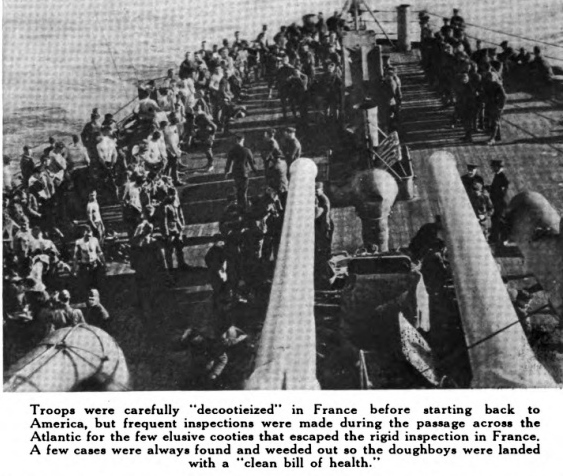 The doctors had little trouble in keeping the men well. One ship had 1,930 passengers on board for nineteen days and yet the percentage of sick was kept below unity. Service in the trenches and active campaigning had made them hard as nails, so I doubt whether you could have killed one of them with an axe. The Navy was very suspicious of cooties. Several weeks before going aboard ship the Army authorities began to inspect and decootieize, and the troops had to be reported all clear before going aboard ship, but the Navy took no chances. Every two or three days during the passage across a cootie inspection was held and, in a few cases it was found that a cootie or so had passed the Army inspection (pretty healthy cootie!). We made short work of them by having the men strip down “to a gantline,” take a brisk scrub in salt water soap and have all his clothing steamed. Second or third inspection almost always found them with a clean bill of health as far as the friendly cooties were concerned.