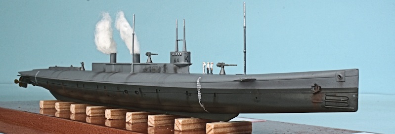 The K class of submarines was the brainchild of Admiral Jellicoe. At 339 ft. long they were nearly twice the size of most other submarines. They were made this long to achieve a top speed on the surface of 24 knots. Unfortunately this meant that when the submarine dived, the bow could be at crush depth whilst the stern was still near the surface. The submarines were steam driven with two funnels that had to be retracted before the dive could take place, and this was a constant source of leaks and problems, and was of particular concern in the case of a crash dive or bad weather.