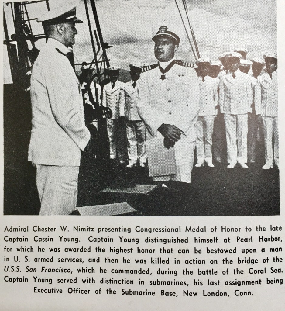 One of the pivotal stories from the book is centered around the attack on Pearl Harbor on December 7, 1941. Eighty years ago, when the Japanese attacked Pearl Harbor, Commander Cassin Young was the commanding officer of the repair ship USS Vestal (AR-4), which was badly damaged by Japanese bombs and the explosion of the battleship USS Arizona (BB-39). Commander Young rapidly organized offensive action, personally taking charge of one of Vestal‘s anti-aircraft guns. When Arizona‘s forward magazine exploded, the blast blew Young overboard. Although stunned, he was determined to save his ship by getting her away from the blazing Arizona. Swimming through burning oil back to Vestal, which was already damaged and about to be further damaged, Young got her underway and beached her, thus ensuring her later salvage. His heroism was recognized with the Medal of Honor.