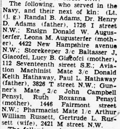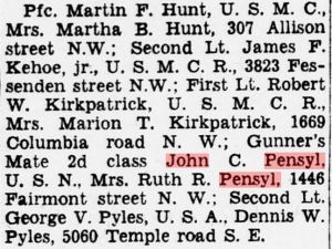 The faint hope that Mrs. Ruth Pensyl, 2037 P street N.W., had held that her son, Gunner’s Mate John Campbell Pensyl had survived the attack on Pearl Harbor flickered out yesterday when the Christmas gift she sent him came back marked “Dead – Return to Sender.”