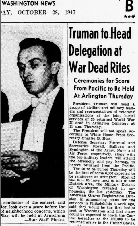 On the eve of Armistice Day 1947, Walter S. Brown (grave 3313), Stanley Dosick (grave 3296), Navy Lt. Comm. John E. French (grave 3060) and Michael C. Yugovich (grave 2811) became part of Arlington. Yugovich celebrated his 20th birthday four days before the 1941 attack that drew America into World War II.