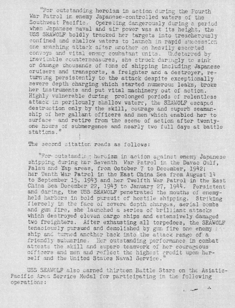 Seawolf was awarded two Navy Unit Commendations for her patrols. From one of the citations: