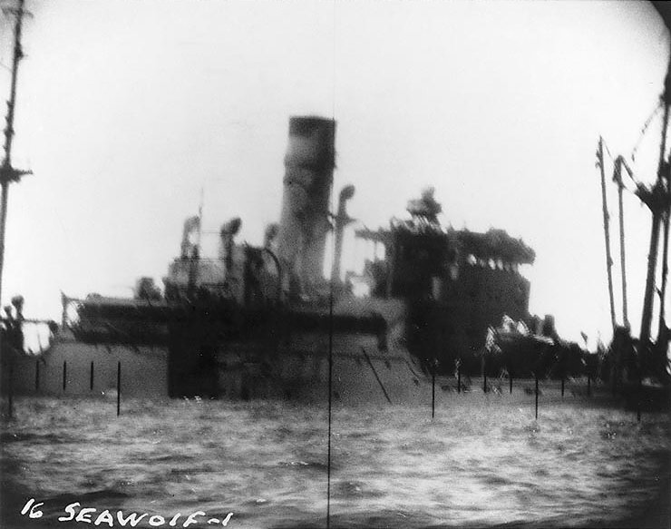 “The searching prow of the sub nosed around northern Luzon, Babuyan channel and Bojeador Cape. Then on 14 December in the aft torpedo room four hisses of the tubes signaled the departure of four tin-fish. Skipper Warder got a last glimpse of the target, a Japanese seaplane tender, before the submarine dove. Scant seconds later, engine room men heard four muffled explosions. On the bottom – quiet reigned. But not for long; the concussion of nearby depth charges shook the Seawolf. For sixty plodding minutes the sickening boom of “cans” jarred the dormant submarine and then heavy silence again filled the ship. At last, assured that the angry surface vessels had gone their way, the Seawolf crept to the top, and finding the coast clear – returned to her home port.”