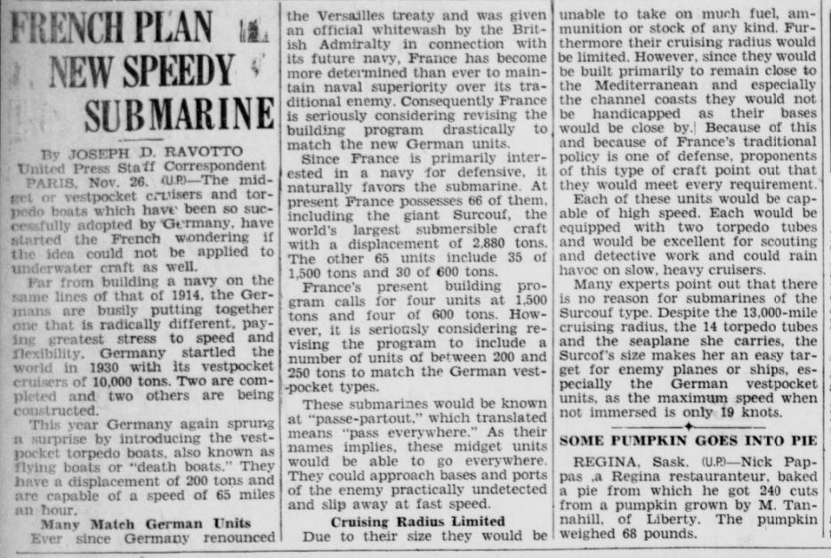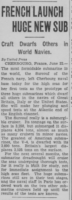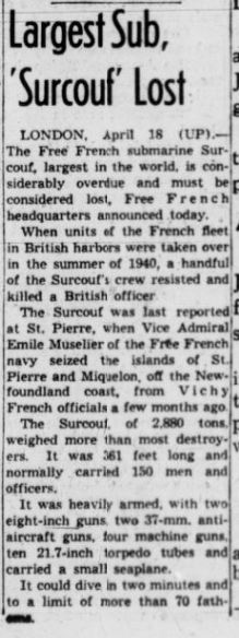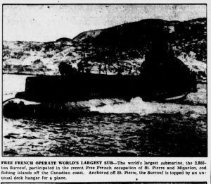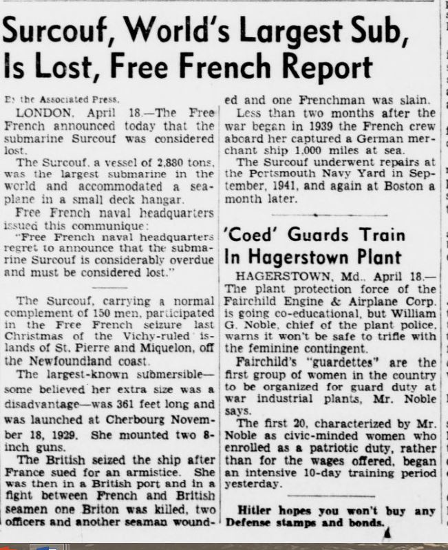 The Washington Times had a picture of an odd-looking French submarine on page A-3 of the January 20, 1942 edition. The caption read: Free French Operate World’s Largest Sub. I had previously written a story about a French submarine that escaped Germany’s clutches at the beginning of the war.