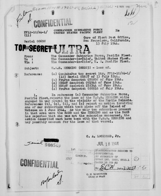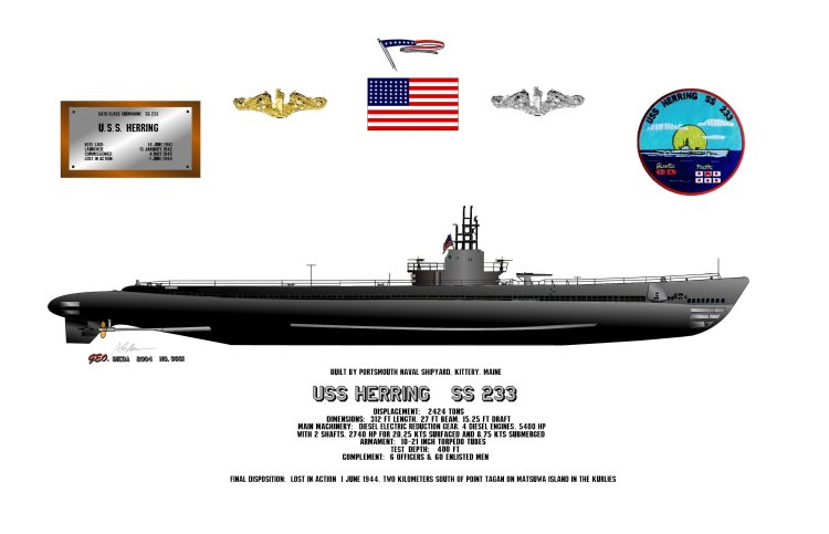 On 21 May 1944, USS HERRING (SS-233) began her eighth war patrol, setting out from Midway en route to the Kurile Islands, an archipelago that stretches over 800 miles from Hokkaido, Japan, to Kamchatka, Russia. On the morning of the final day of the month she met up with USS BARB (SS-220). “Held megaphone conference,” the commanding officer of BARB wrote in his patrol report. “Decided Barb would cover area south and west of lane, Herring to north and east to Matsuwa.” At 1120: “Secured conference and headed south for roving patrol along lane.” HERRING would never be seen or heard from again.