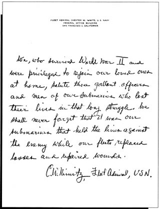 “We, who survived World War II and were privileged to rejoin our loved ones at home, salute those gallant officers and men of our submarines who lost their lives in that long struggle. We shall never forget that it was our submarines that held the lines against the enemy while our fleets replaced losses and repaired wounds.”