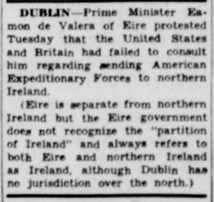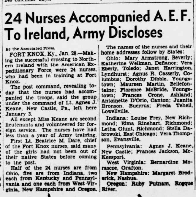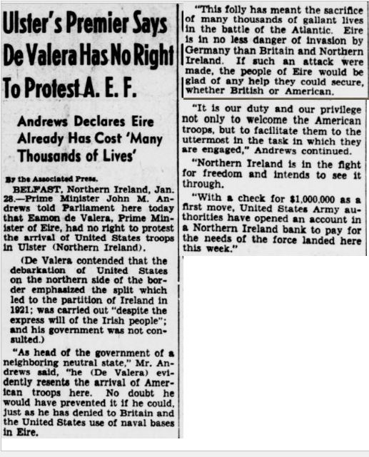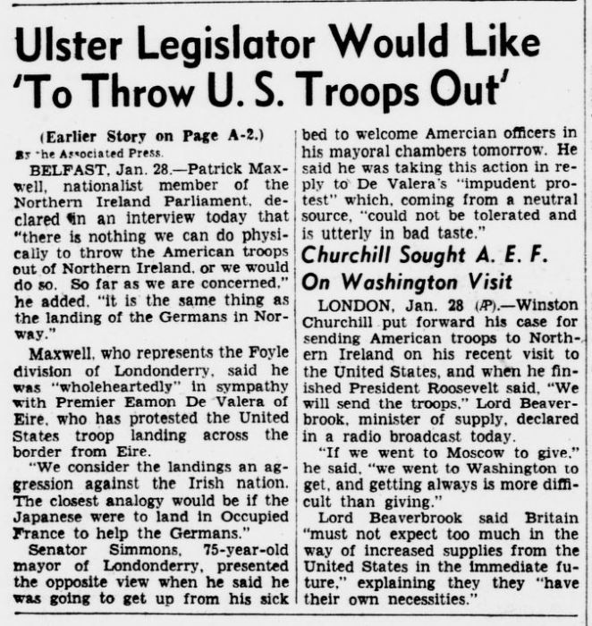 But a story from the newspapers of January 28, 1942, caught my eye. The story was about the arrival of the US Army in Belfast Northern Ireland.