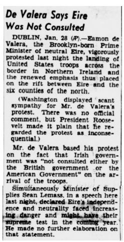 The leadership of Ireland was not happy to see a foreign army replacing the British in the northern counties. Eamon de Valera loudly protested that his government had not been consulted. Even in the US Congress, several prominent Republican members protested that this small contingent was being sent on a suicide mission. They also questioned why our boys were not being shipped to relieve the Philippines. After all, we had a direct interest in trying to fight off the Japanese forces that were about to overrun our furthest outpost in the Pacific.