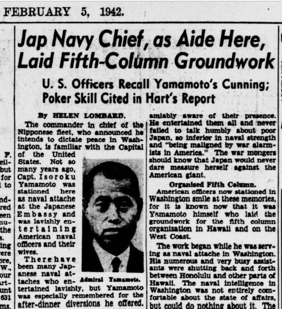 US Officers recall Yamamoto’s Cunning; Poker Skill Cited in Hart’s Report