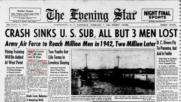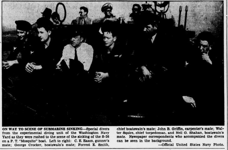 Rescue operations under command of Rear Admiral Frank H. Sadler, commandant of the 15th Naval District, and Capt. Thomas J. Doyle were begun immediately after the sinking the Navy said. Divers were flown from Washington to the Canal Zone to assist the divers already engaged in the operations there. The divers from Washington were Forrest E. Smith, chief boatswain’s mate; Walter Squire, chief torpedo man; G. E. Eason, gunner’s mate; George Crocker, boatswain’s mate; John B. Griffin, carpenter’s mate, and Nell G. Shahan, boatswain’s mate. When the Navy gave up hope of finding life on board the next of kin of the casualties were notified. Salvage operations were continued, however. Built Between 1918 and 1923. The S-26 was built by the Bethlehem Shipbuilding Co. between 1918 and 1923. It was commissioned October 15. 1923. It had a surface displacement of 800 tons and a sub[1]merged displacement of 1,062 tons. It is of the general type used In World War I and is of a newer design than the 0-9 which sank last summer. The Navy said the collision which caused the sinking occurred while the submarine was operating on the surface. While the Navy did not give details of the collision, it was pointed out by persons familiar with submarine operation, that when a submarine is in surface condition, it is much more vulnerable to a collision than when ready for submersion. The blow from the colliding vessel might have hit almost anywhere, they said, except the center where the men assembled after the sinking and from where the buoy message was sent. When a submarine is set for submerging its watertight integrity is much higher than when it is operating on the surface for it then is highly compartmented with closed bulkheads. The craft was 219 feet in length and was powered by two sets of 600 I B. H. P. Nelseco diesel engines. Armament carried by this type of submarine was one four-inch gun and four 21-inch torpedo tubes. It was a submarine of this general type, the S-1, that was experimentally fitted out to carry a small seaplane in a cylindrical tank in 1923.