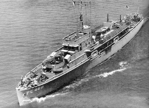 PC-460 started life as the yacht ELDA, 154′, 380 T., built in 1930 by Consolidated Shipbuilding Corp. in Morris Heights, New York. In 1940 the US Navy acquired the yacht from Mr. Arthur Davis of New York City and converted it to a Patrol Craft for war duty, giving her the designation PC-460. She arrived in the Panama Canal Zone area on 13 November, 1940. She was operating at night with a number of submarines, including S-26, in the eastern (Pacific) approaches to the Panama Canal. The submarines were running on the surface, and PC-460 signaled that she was leaving the group. Apparently, only one of the subs received the message, however. PC-460 turned, cutting deeply into the pressure hull of S-26 and sinking her. Only the three men on the sub’s conning tower survived, being thrown clear. The patrol craft was badly damaged also, and limped from the area, leaving other ships to attempt a rescue/salvage operation.