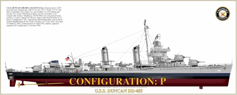 In a brief but gallant career, USS Duncan (DD 485) carried on the fighting reputation of her namesake, Commander Silas Duncan. Before being sunk by crossfire from Japanese warships during the surface engagement off Cape Esperance on 11–12 October 1942, Duncan’s gunfire and torpedoes contributed to the destruction of an enemy cruiser.