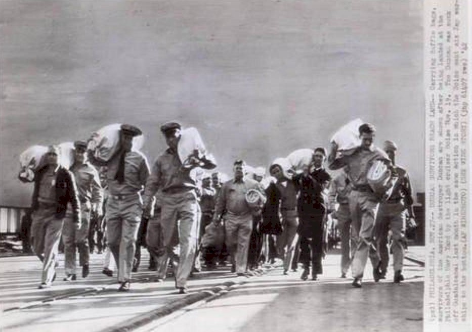 When the crew members, trapped in the bow and on the bridge, were forced by fire to drop into the water, Duncan still had considerable forward speed. And by the time the wounded were lowered into the water and the remaining survivors had jumped, individuals were scattered over a wide area. The majority were picked up in scattered groups of two or three and many were all alone.