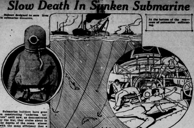 “Above him, he knows, are other United States ships, with their happy care-free crews. Faraway on shore are hundreds of Americans enjoying themselves in freedom. But there at the bottom of the sea were 21 stalwart sons of Uncle Sam doomed to a terrible death and destined to face death like the iron men the United States Navy produces. If it had been on shipboard with national airs playing and a foe in sight these men would have rushed into a thousand dangers and gladly gone to death for the defense of their country. But here they were prisoners with not even a glimpse of the sun to liven them, to cheer them in their last hours.