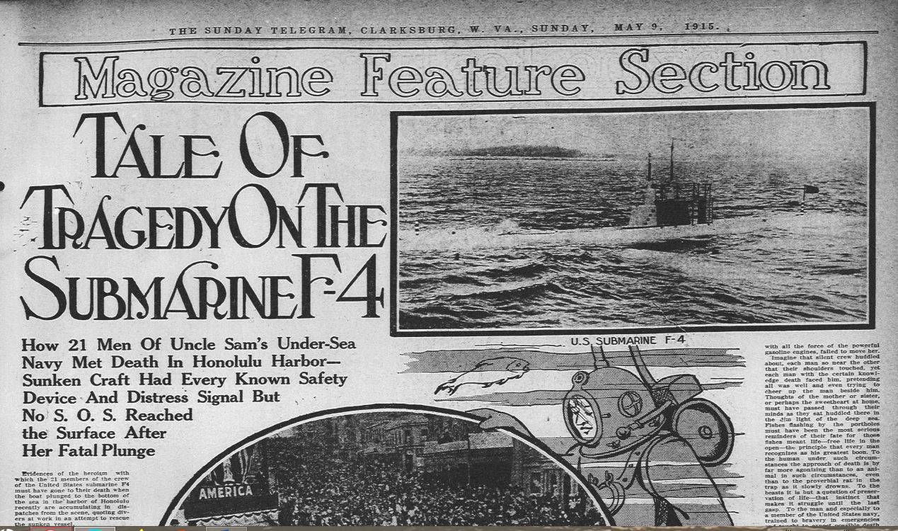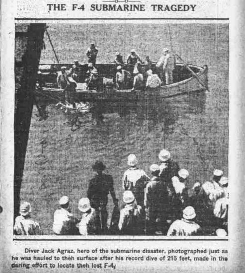 “Whether the engines of the F4 refused to work when she got to the bottom of the sea, whether her sides caved in under terrific pressure, or the exact nature of the incident that left her helpless at such a depth can only be surmised. When a week passed without any chance of lifting the vessel all hope for her crew was given up. In fact there had been grave doubts as to anyone being alive within for no U.S. SUBMARINE F-4 sound had been heard from any of her apparatus for communicating with other vessels.