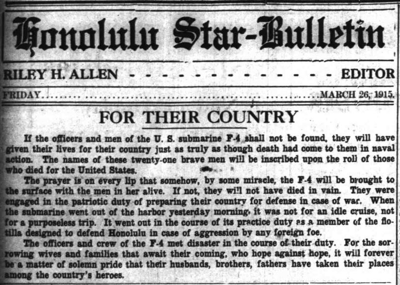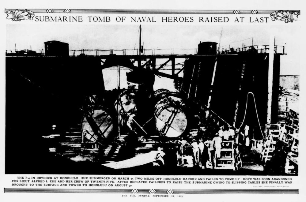 It was on the morning of March 25, 1915, that F-1, F-3, and F-4 left Honolulu for local operations. F-4 did not return, and the eventual detection and recovery was a classic of naval salvage.