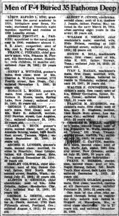 “Death was showing mercy. The tired captain, his head sunk on his breast, still stood half unconscious and also in a coma. His work was over when the hand of death took charge of the wheel of that vessel, but death was slow, although it had kindly given him the anesthesia of unconsciousness. Thus the crew of F4 went to its death. Historians may add another chapter to the history of the United States when that hulk is raised and the bodies recovered.”
