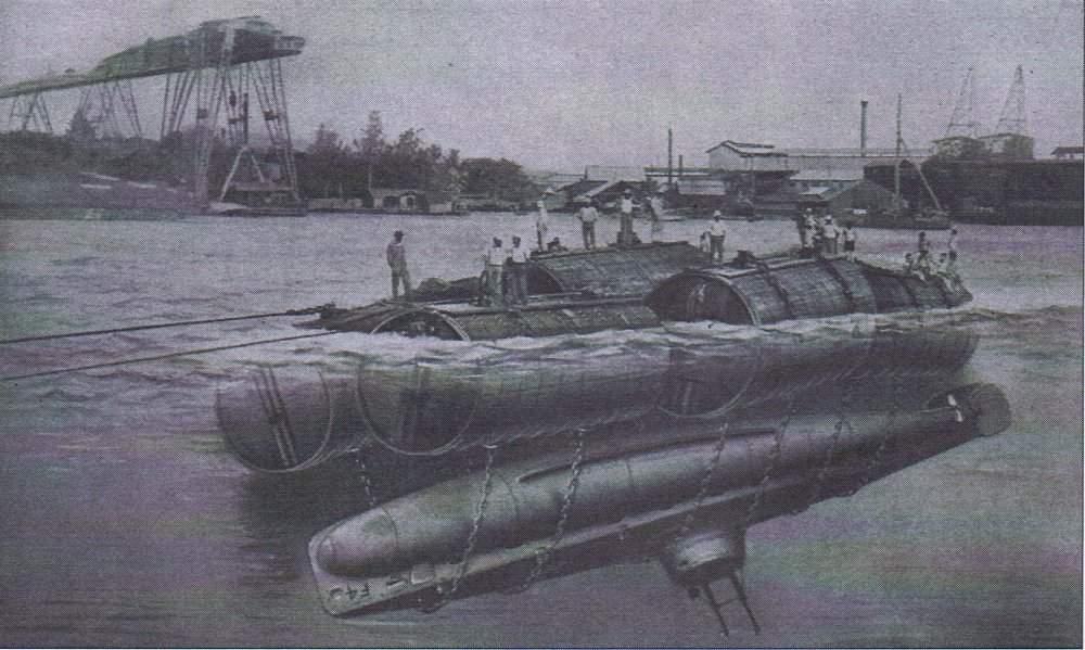 The submarine was then within 50 feet of the surface, but the risk of completing the work with the appliances at hand was too great, and six pontoons were therefore specially constructed at the Mare Island Navy Yard and brought to Honolulu on board the Maryland, arriving on August 12. By this means on August 29 the submarine was finally raised. The dead weight lifted was 250 tons, from a depth of 305 feet, 1% miles out from the harbor in the open sea. It was a feat unprecedented in the annals of any navy, and credit therefor belongs in large measure to Rear Admiral C. B. T. Moore, Naval Constructor J. A. Furer, and Lieut. C. E. Smith, in addition to the divers already mentioned.