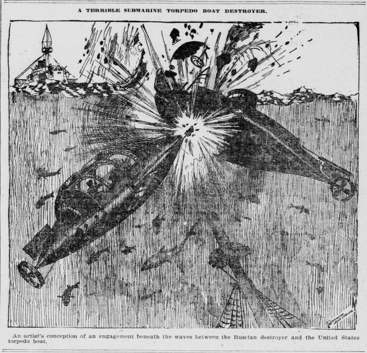One features of such encounters, awful to contemplate, is that no inkling of the fate that befell the boats would ever come to the surface in the event of an encounter proving fatal. Beneath the surface of the water the hostile submarine craft would fight it out with only the fishes as witnesses of the duel, and should both be blown up, as will be not unlikely where the weapons are so destructive and so easily used, the boats will sink to the bottom without a ripple having appeared above to inform the world of the fate of the fighters. A submarine boat’s crew will say good bye to friends with the knowledge that they may never be heard of again after they dive beneath the waves on a hostile errand. It is difficult to imagine a more terrible encounter than this one. There will be none of the noise and grandeur of a battle under the conditions of a naval fight on the surface of the ocean. The crews of the submarine boats, shut in a hermitically sealed case, will hear nothing and probably see little of the effect of their onslaught on the enemy. There will be no cheers of victory to make dying less bitter to the fatally wounded. War will be robbed of all the pomp and ceremony with which romance clothes it to the disgust of those who have experienced its realities. Beneath the waves the submarine duel will be a silent, swift and terrible encounter with escape from death depending on hairbreadth chances for all engaged In the fight. If Spain does acquire the Russian submarine boat, there will be plenty of heroes among the United States naval heroes who will be willing to sacrifice their lives in either the Holland or the Plunger in tackling Spain’s new craft in a fight beneath the waves.