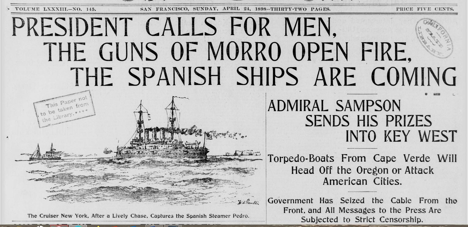 In early 1898, President McKinley had ordered the U.S.S. Maine to Cuba to bring back American citizens – on February 15 the ship exploded, killing 260 men. “Remember the Maine” became a calling symbol for the war that was to follow.