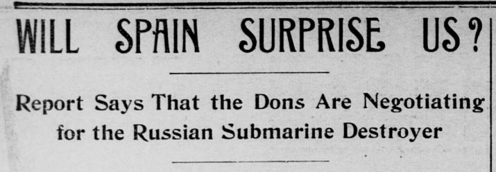 Spain at least is concerned about the presence of the Holland and Plunger among the fighting vessels that she would have to grapple within the event of a war with this country, it is reported that Spain is seeking to acquire possession of the Russian Submarine destroyer invented by Sergius Rokosfpky, and now lying somewhere in the waters of the czar’s dominions. With the most particular care taken to guard her against the prying eyes of foreign spies, for fear that this trump card of the Russian navy be rendered less effective when the time comes for its use, by the fact that there are others of a like nature in existence. Should Spain acquire this boat, the dream of Jules Verne will be improved upon in a terrible manner, for the next naval war may witness a fight beneath the waves. In which the combatants will be the submarine destroyers of the hostile nations. It would certainly be the strangest battle of the century, and almost impossible to invest with more terrors than the mere fact of the fighting being all carried on beneath the waves can give it.