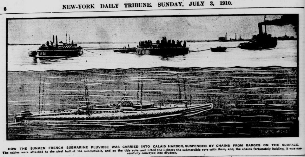 Divers who went down after the Pluviose was sunk carrying below steel cables with which ineffectual attempts were made with a huge derrick above to bring the Pluviose to the surface reported that they heard rapping in the interior of the submarine. In any event when days later the Pluviose was raised and tugged into shallow water none that had been aboard of her was alive. She had filled completely with water As she was raised the water poured from the great gash that had been out in her steel casement by the Channel steamship