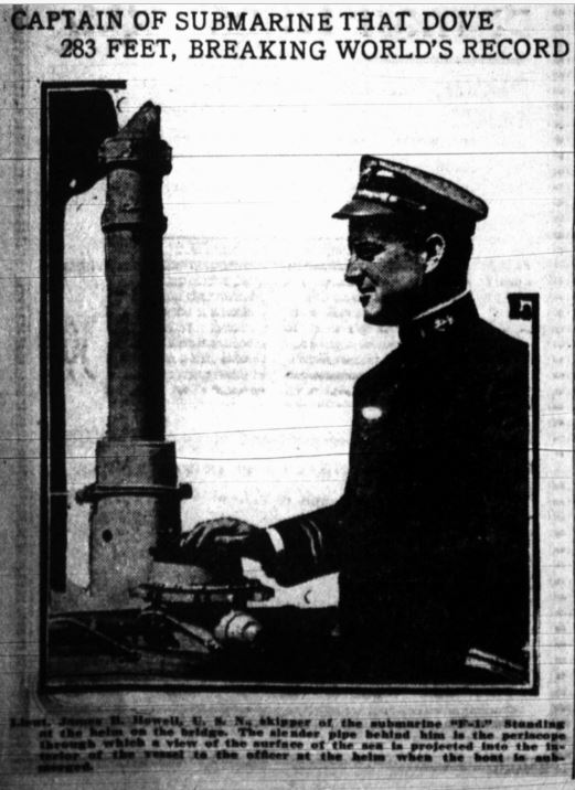 - The United States navy submarine F-1, which yesterday broke all diving records of the world by plunging 283 feet beneath the waves with 26 men and its nervy commander, Lieutenant James B. Howell, U.S.N.