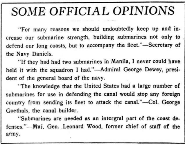 “When the relative sizes of the fleets of the great nations enumerated above are considered, it will be seen that the United States possesses a submarine flotilla relatively and actually very powerful. England’s fleet is more than twice as great as that of this country, yet she has but little more than half as many more submarines. France has a considerably larger submarine fleet than ours, with a smaller navy, but she has in the past taken the lead in submarine building, and this lead England has overcome, and we are on that road. Germany, with a more powerful fleet than ours, has many less submarines, and Japan, with a fleet approaching ours in strength, has only half as many submarines.