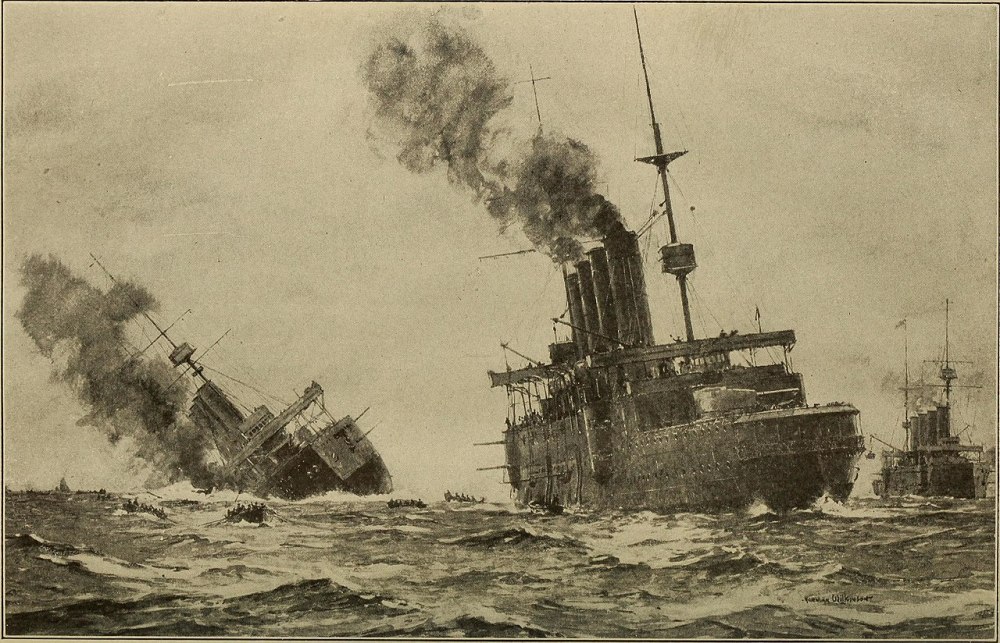 “The destruction of the three British cruisers, Hogue, Cressy and Aboukir, by the German submarine U9 and later the sinking of the Hawke by the same submarine was taken as proof of the impotence of surface craft.