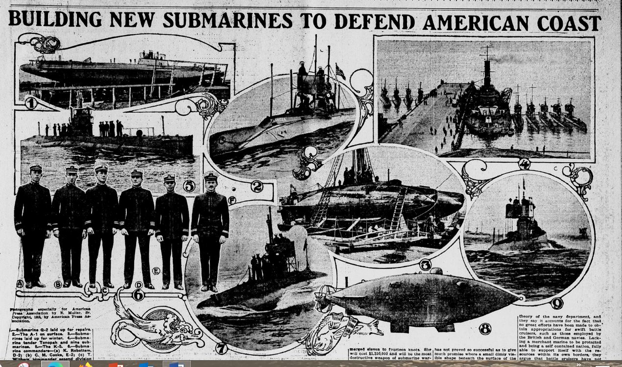 The other nations had adopted the same idea and announcement was made that the United States navy was equipped with such boats and guns. Experiments are being conducted to determine the value of electric batteries to propel submarines for submerged operations. It is confidently believed that when the general naval board is ready to make its formal report next month the number of new submarines recommended will depend on the number of batteries and engines, available at that time.