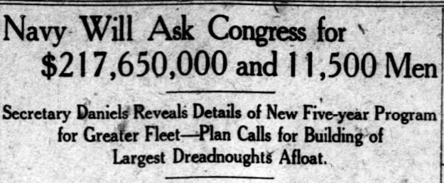 This five-year program for new construction in the navy and for “increased personnel which the President win submit to Congress this winter was made public last night in detail by Secretary of the Navy Daniels. It calls upon Congress to appropriate this year $217,650,000, an increase of ‘about $65,000,000 over the current naval appropriation.