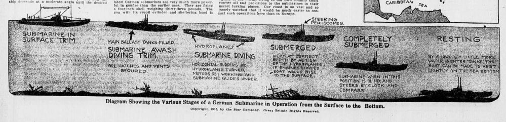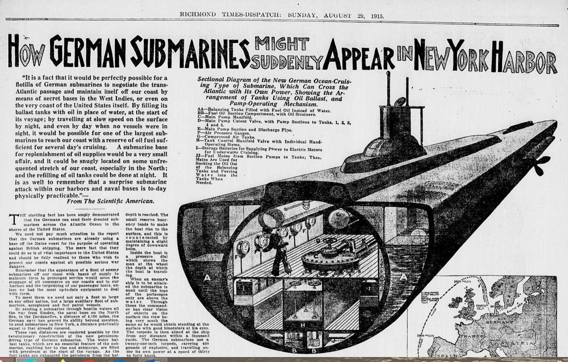 “It is a fact that it would be perfectly possible for a flotilla of German submarines to negotiate the trans-Atlantic passage and maintain itself off our coast by means of secret bases in the West Indies, or even on the very coast of the United States itself by filling its ballast tanks with oil in place of water, at the start of its voyage; by travelling at slow speed on the surface by night, and even by day when no vessels were in sight, it would be possible for one of the largest submarines to reach our coast with a reserve of oil fuel sufficient for several day’s cruising. A submarine base for replenishment of oil supplies would be a very small affair, and it could be snugly located on some unfrequented stretch of our coast, especially in the North; and the refilling of oil tanks could be done at night. It is as well to remember that a surprise submarine attack within our harbors and naval bases is today physically practicable.” From The Scientific American.