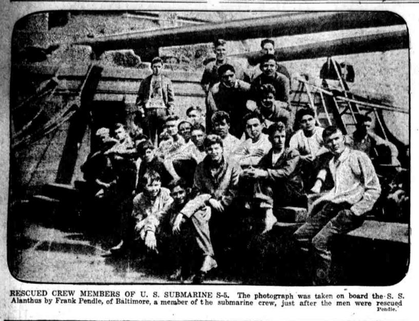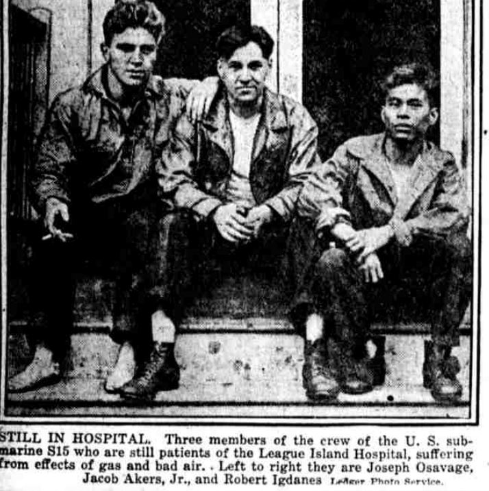 The thirty-eight officers and men who were rescued from the submerged United States submarine S-5 after Chief Engineer Grace of the steamship Gen. George W. Goethals had cut holes In her plates with a hand drill were landed at the Philadelphia Navy Yard last night shortly before midnight from the destroyer Biddle, to which vessel they had been transferred during the afternoon from the battleship Ohio. Dispatches from Philadelphia said that all of the men were still suffering from their experience, but that only three were In the destroyer’s sick bay. These are Joseph O. Savage of Eleco, Pa.; Jacob Akers of Warnecliff, W. Va., and Robert Igdanes, Manila, P. I. All of the men were sent to naval hospitals for treatment.